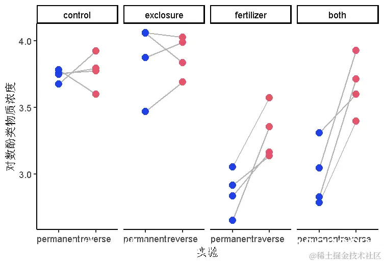 16个5x5米的小区中的每一个都被随机分配到四个实验之一。1)用栅栏围起来排除食草动物;2)用N-P-K肥料施肥;3)用栅栏和施肥;4)未实验的对照。然后,16块地中的每一块被分成两块。每块地的一侧(随机选择)在20年的研究中持续接受实验。每块地的另一半在头十年接受实验,之后让它恢复到未实验的状态。这里要分析的数据记录了欧蓍草(Achillea millefolium)中酚类物质的浓度(对植物防御化合物的粗略测量),欧蓍草是地块中常见的草本植物。测量单位是每克干重毫克丹宁酸当量。