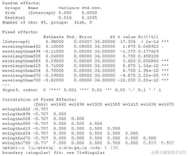 - 检查随机效应的输出。我们的混合效应模型中再次出现了两个随机误差的来源。它们是什么?其中哪个对应于输出中的"(截距)",哪个对应于 "残差"?注意,在这个数据集中,其中一个变化源的估计标准差非常小。这就是畸形拟合信息背后的原因。鱼类之间的方差不太可能真的为零,但是这个数据集非常小,由于抽样误差,可能会出现低方差估计。