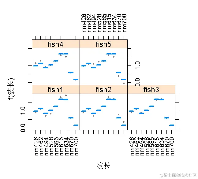 - 使用交互图来比较不同光波长实验下的个体鱼的反应。