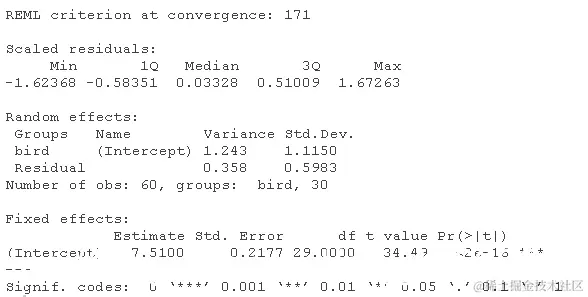 拟合一个线性混合效应模型。summary()的输出将显示两个随机变异的来源:单个鸟类之间的变异(鸟类截距),以及对同一鸟类进行的重复测量之间的变异(残差)。每个来源都有一个估计的方差和标准差。固定效应只是所有鸟类的平均值--另一个 "截距"。