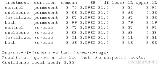 由于随机效应也存在(块),系数表将显示两个随机变化来源的方差估计。一个是拟合模型的残差的方差。第二个是(随机)块截距之间的方差。