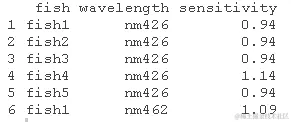 Cronly-Dillon和Muntz(1965; J. Exp. Biol 42: 481-493)用视运动反应来测量金鱼的色觉。在这里,我们将对数据进行拟合,包括测试的全部波长。5条鱼中的每一条都以随机的顺序在所有的波长下被测试。敏感度的值大表明鱼可以检测到低的光强度。视运动反应的一个重要特点是,鱼不习惯,在一个波长下的视觉敏感度的测量不太可能对后来在另一个波长下的测量产生影响。