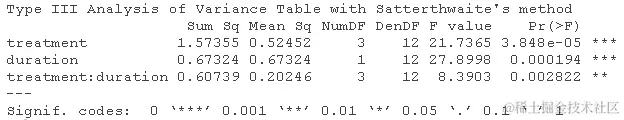 - 生成固定效应的方差分析表。哪些项在统计学上是显著的?