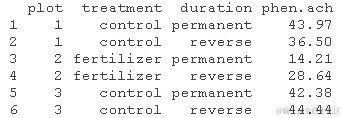- 检查前几行的数据。实验是作为一个有四个层次的单一变量给出的(而不是作为两个变量,围墙和肥料,用2x2因子设计的模型)。持续时间表示半块土地是否接受了整整20年的实验,或者是否在10年后停止实验。变量 "ch "是蓍草中酚类物质的浓度。