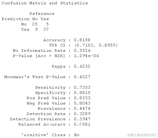 我们可以得出结论,我们的准确率为81.58%,90.26%的预测值位于曲线之下。同时,我们的错误分类率为18.42%。
