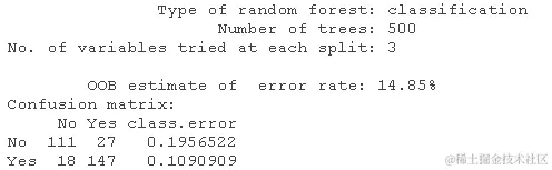 红线代表没有心脏病的MCR,绿线代表有心脏病的MCR,黑线代表总体MCR或OOB误差。总体误差率是我们感兴趣的,结果不错。