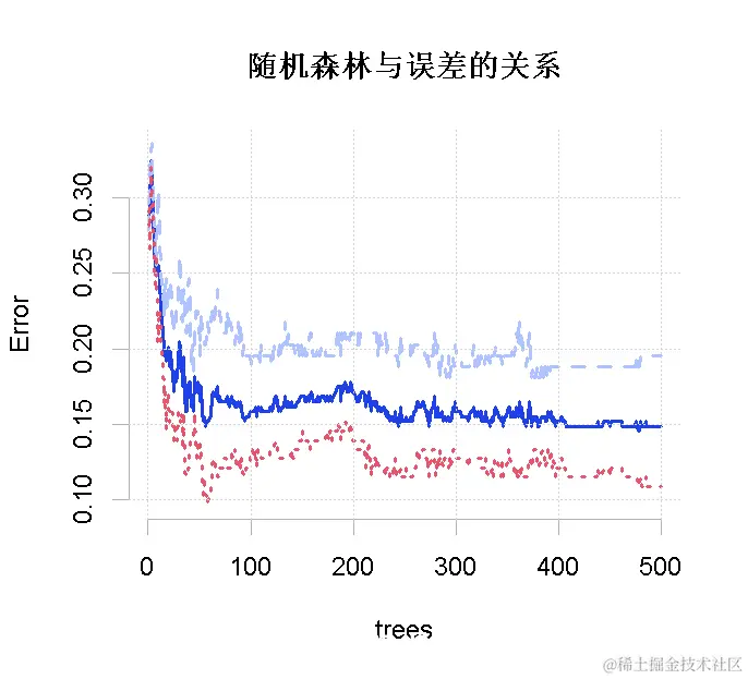 在图上绘制出随机森林与误差的关系。