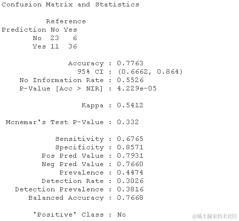 我们可以得出结论,在Naive Bayes算法的帮助下生成的模型准确率为78.95%,或者我们也可以说Naive Bayes算法的错误分类率为21.05%。