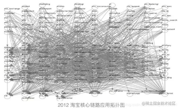 服务端非常复杂,就像下图的阿里核心链路图,包含大约150个组件,组件与组件之间进行交互,形成了密集的后端网络。UI测试无法覆盖这么复杂的组件交互网络,所以要绕过客户端,直接使用接口测试对服务端进行测试。
