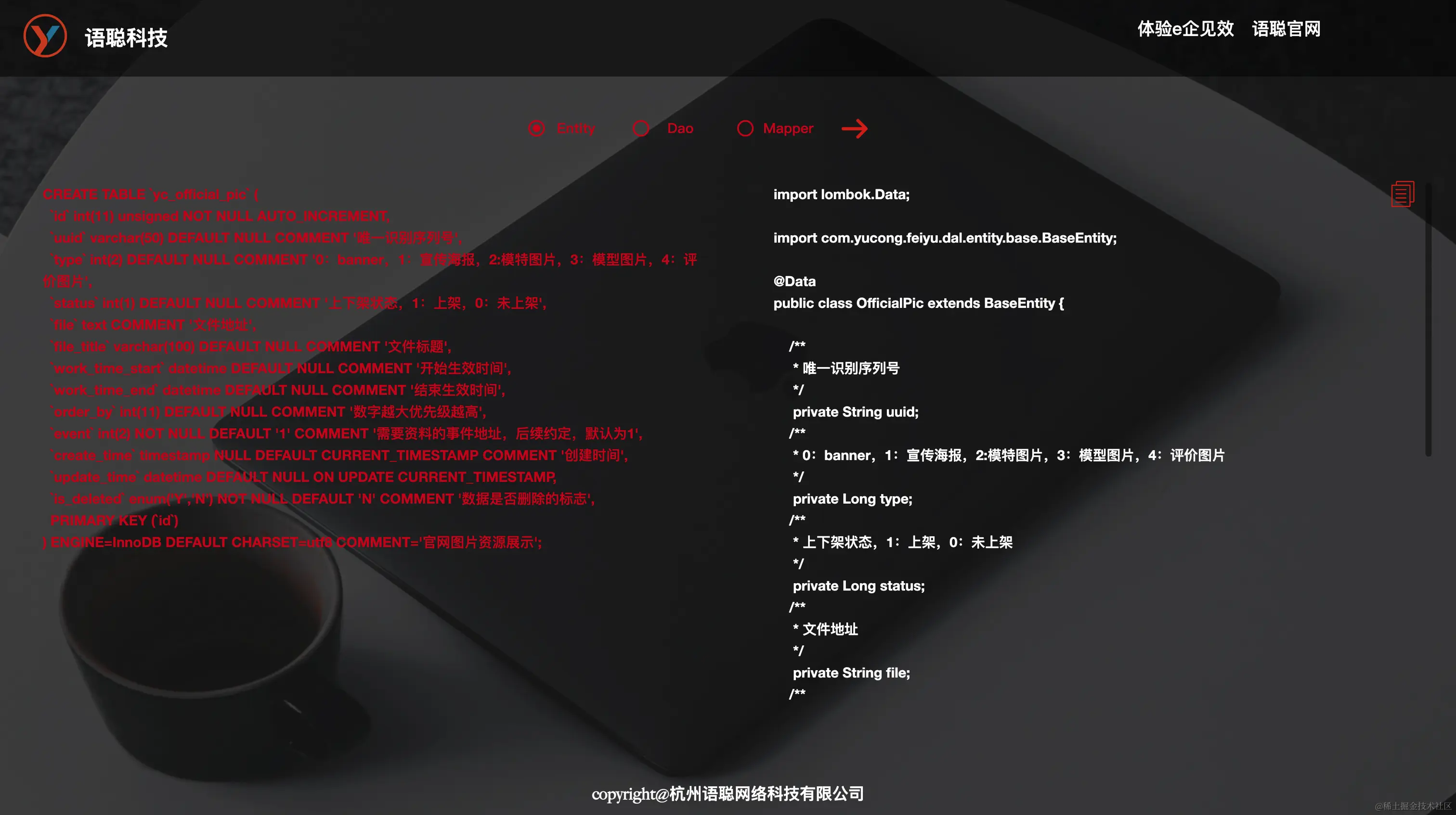 语聪科技代码生成器 用户1749374917553 2021-07-14 175 阅读1分钟 Java开发经常需要自己通过SQL要生成java代码,这让所有开发人员都觉得异常麻烦,不过它来了,它来了,它踏着快乐的步伐走来了–语聪代码在线生成器,这是语聪科技公司内部在使用的代码生成器,而且它完全免费!!!!! 简直就是程序员的福音啊!!! 简单的来说就是用你的sql脚本粘贴到左侧输入框里,选择你要生成的文件模板,点击中间向右的箭头就会在右侧生成你需要的代码, 如下变我这样: 最后在这里附上工具的地址:语聪科技代码生成器