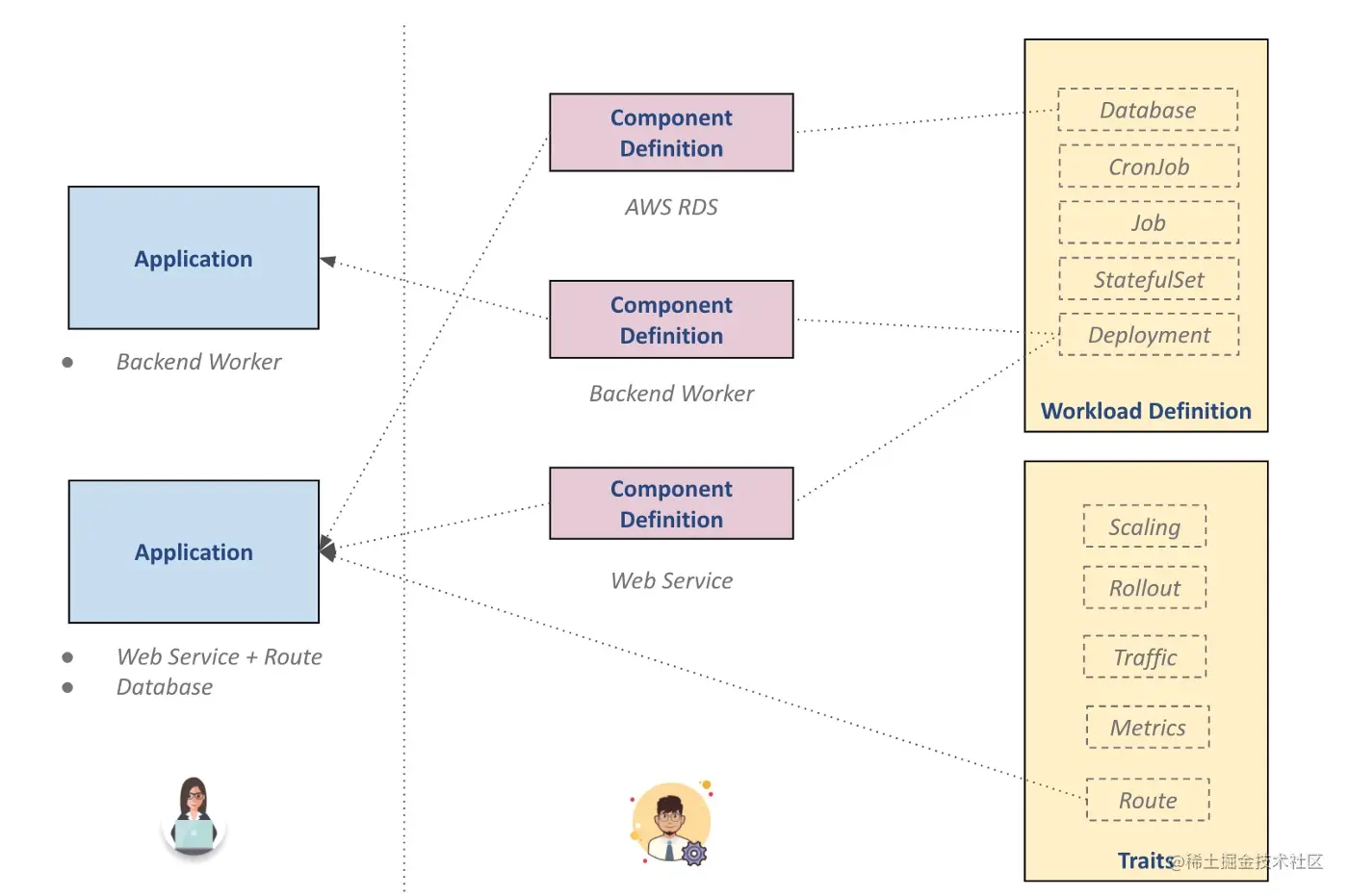 Kubevela 是 OAM 模型的一个实现。KubeVela 与运行时无关,可本地扩展,但最重要的是,以应用程序为中心 。在 Kubevela 中,应用程序是作为 Kubernetes 资源实现的一等公民。**集群运营商(Platform Team)和开发者(Application Team)**是有区别的。集群操作员通过定义组件(组成应用程序的可部署/可配置实体,如 Helm Chart)和特征来管理集群和不同的环境。开发人员通过组装组件和特征来定义应用程序。