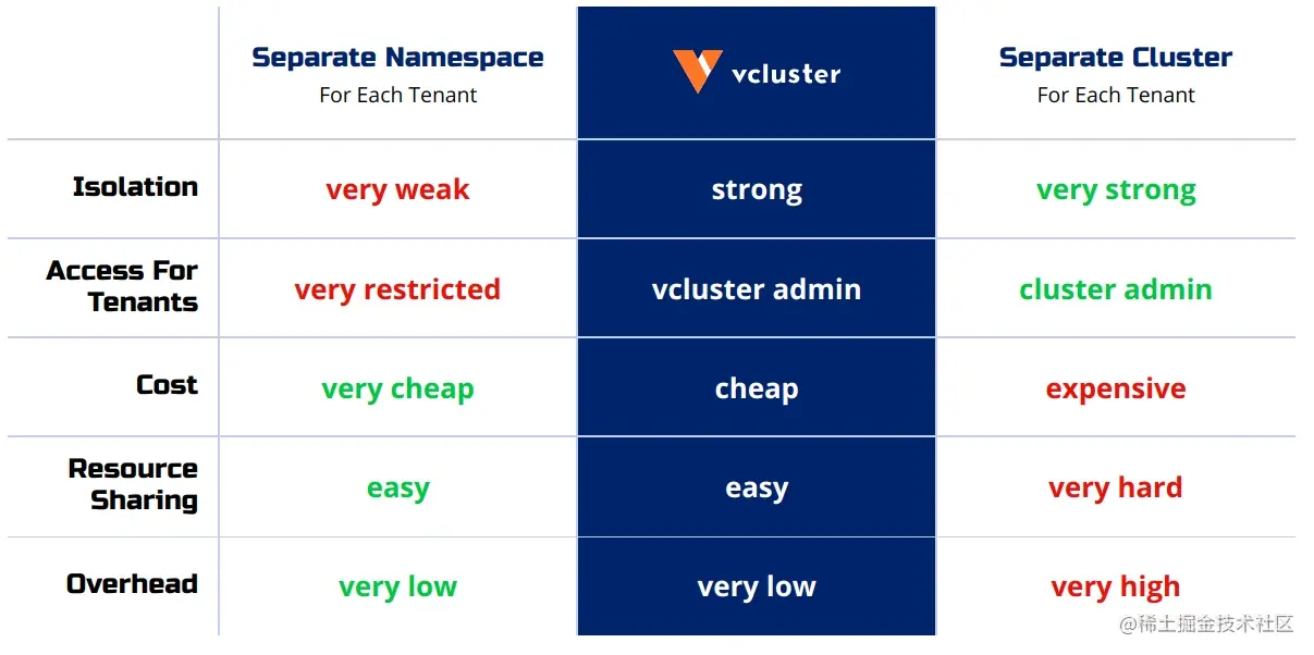 vCluster 使用 k3s 作为其 API 服务器,使虚拟集群超轻量级且经济高效;由于 k3s 集群 100% 合规,虚拟集群也 100% 合规。vClusters 是超轻量级的(1 个 pod),消耗很少的资源并且可以在任何 Kubernetes 集群上运行,而无需对底层集群进行特权访问。与 Capsule 相比,它确实使用了更多的资源,但它提供了更多的灵活性,因为多租户只是用例之一。