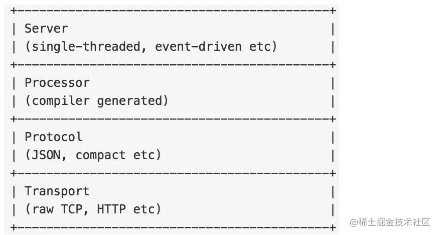thirft使用socket进行数据传输,数据以特定的格式发送,接收方进行解析。我们定义好thrift的IDL文件后,就可以使用thrift的编译器来生成双方语言的接口、model,在生成的model以及接口代码中会有解码编码的代码。thrift网络栈结构如下: