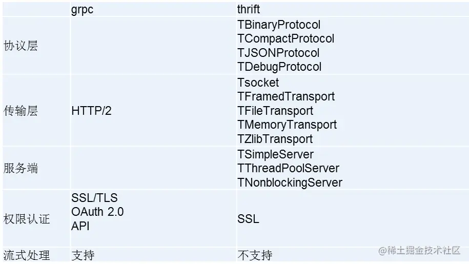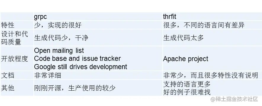 - Thrift的数据格式是用的现成的,没有单独搞一套,但是它在传输层和服务端全部是自己造轮子,所以可以对协议层、传输层有多种控制要求。