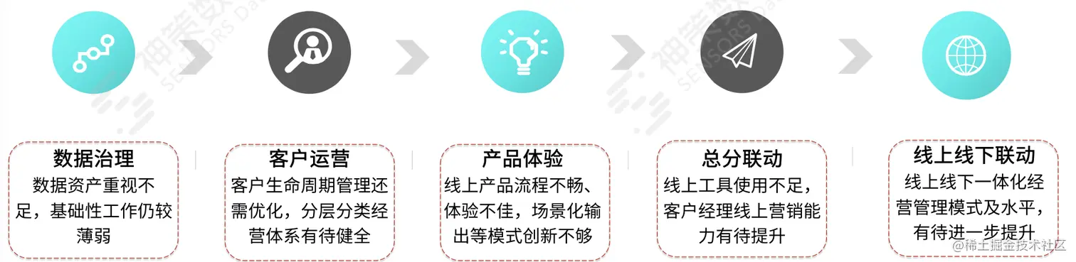 基于以上银行趋势分析,我们可以发现,银行数字化转型过程中会面临以下 5 大问题: