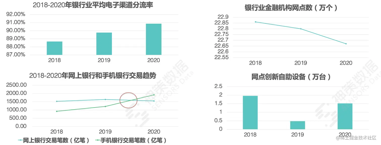 在中国银行业协会发布的《2020 年中国银行业服务报告》中,从服务文化提升、服务渠道拓展、流程整合优化、服务实体经济、产品创新发展、消费者权益保护、发展挑战与机遇等方面,再现了 2020 年银行业金融机构的发展成果。其中,在银行业电子银行、网点数字化转型方面,有两大结论: