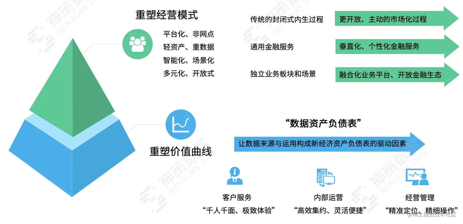 整体来说,银行业的战略转型,其目标都是重塑经营模式和价值曲线,一方面减少业务开展对介质的依赖,通过线上线下融合打造金融场景生态,另一方面增强数据过程的价值支撑,以实现客户价值最大化。如下图所示: