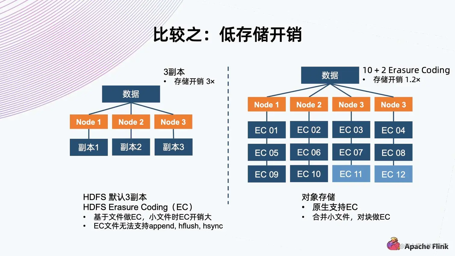 - 同时,HDFS 一旦 EC,就不能再支持 append、hflush、hsync 等操作,这会极大地影响 EC 能够使用的场景。对象存储原生支持 EC,对于小文件的话,它内部会把小文件合并成一个大的块来做 EC,这样确保数据开销方面始终是恒定的,基于预先配置的策略。