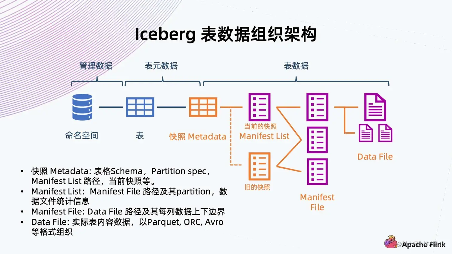 - 可以看到右边从数据文件开始,数据文件存放表内容数据,一般支持 Parquet、ORC、Avro 等格式;