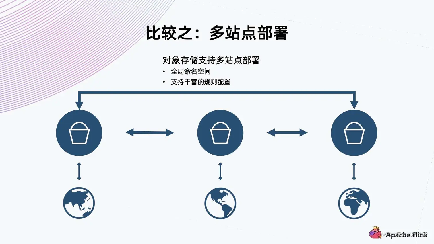 - 对象存储的多站点部署能力适用于两地三中心多活的架构,而 HDFS 没有原生的多站点部署能力。虽然目前看到一些商业版本给 HDFS 增加了多站点负责数据的能力,但由于它的两个系统可能是独立的,因此并不能支撑真正的全局命名空间下多活的能力。