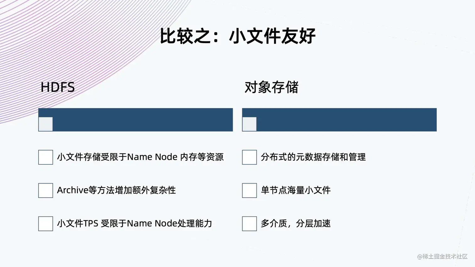 - 同样,小文件的 TPS 也是受限于 Name Node 的处理能力,因为它只有单个 Name Node。对象存储的元数据是分布式存储和管理,流量可以很好地分布到各个 Node 上,这样单节点就可以存储海量的小文件。