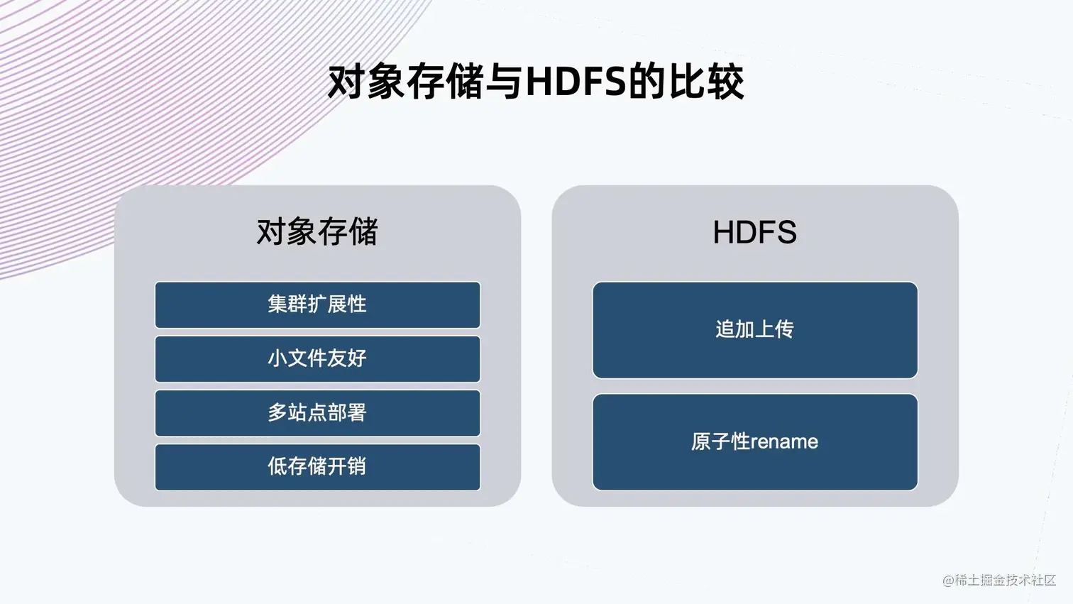 如下所示,我们从各个角度将对象存储和 HDFS 进行对比。