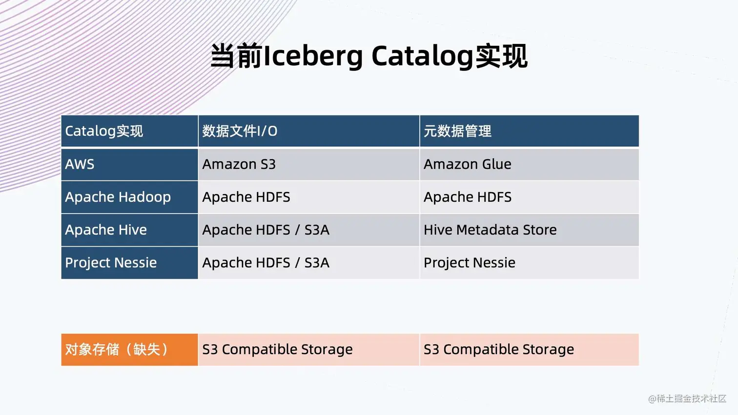 基于 S3 标准的对象存储和 Iceberg 问题的解决方案存在一些问题,例如性能损失,或者需要额外部署锁服务等。