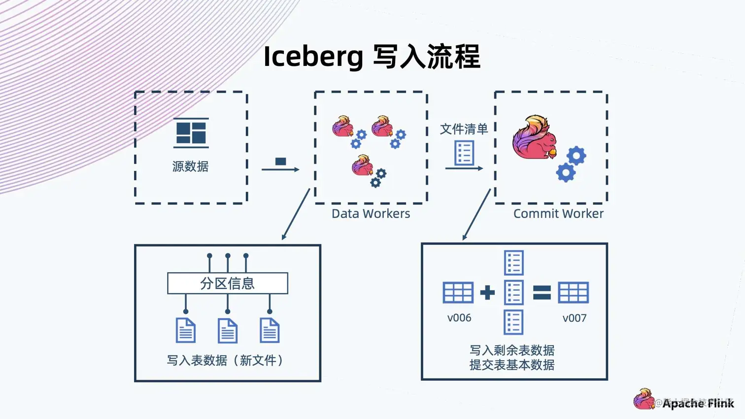 上方为 Iceberg 数据写入的流程图,这里用计算引擎 Flink 为例。