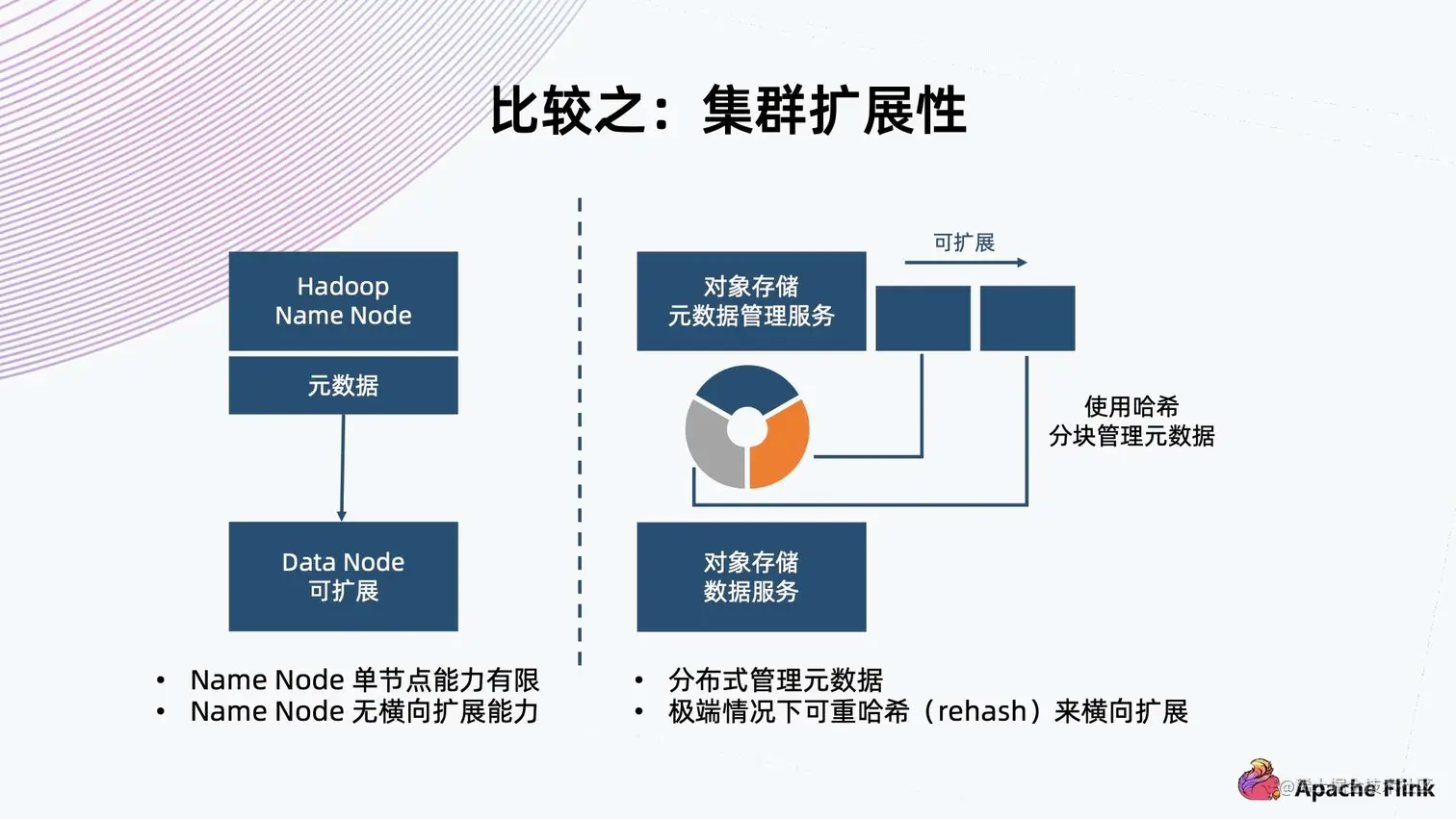 - 对象存储一般采用哈希方式,把元数据分隔成各个块,把这个块交给不同 Node 上面的服务来进行管理,天然地它元数据的上限会更高,甚至在极端情况下可以进行 rehash,把这个块切得更细,交给更多的 Node 来管理元数据,达到扩展能力。