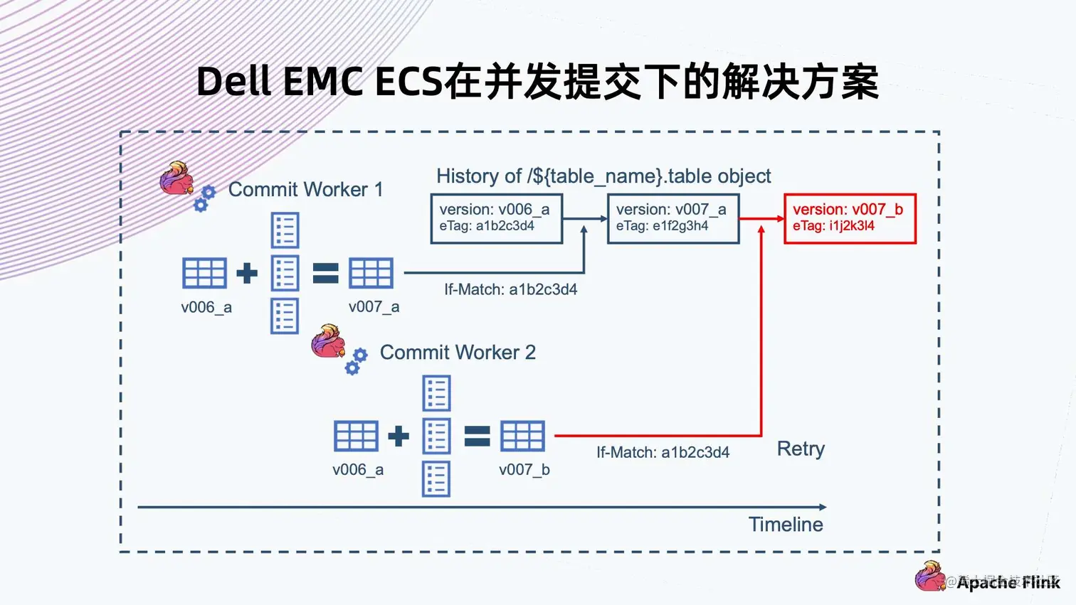 - 另一种情况,是 Commit Worker 2 也拿到了 v006 的 eTag,然后上传的时候发现拿到 eTag 跟当前系统里文件不同,则会返回失败,然后触发 Retry。