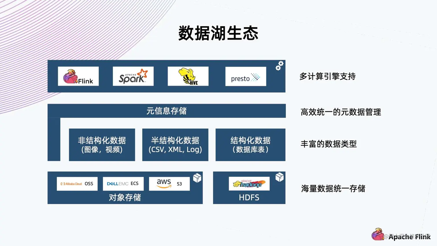 - 最后,我们需要支持丰富的计算引擎,包括 Flink、Spark、Hive、Presto 等,从而方便对接企业中已有的一些应用架构。