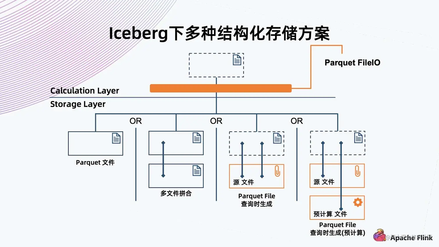 比如最极端的情况,源文件的一个信息记录在 Iceberg 中,就不存这个 Parquet 数据文件。当要查询的时候,通过定制 File IO,让它根据原文件在内存中实时生成一个类似于 Parquet 的格式,提交给上层应用查询,就可以达到一样的效果。