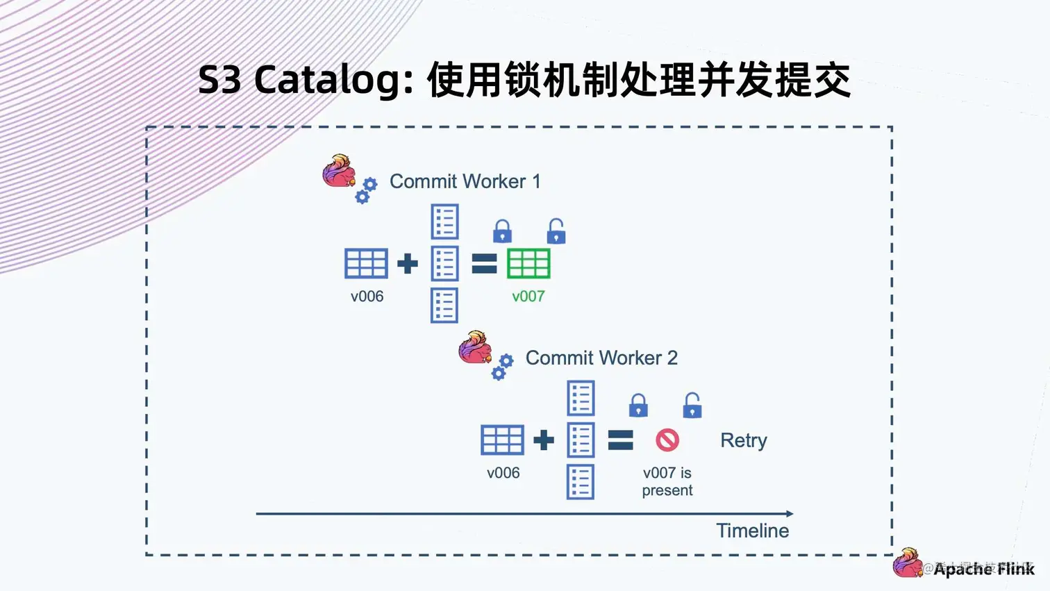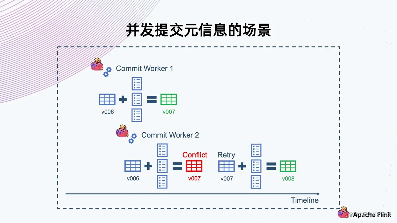 - 同样,Commit Worker 2 拿到 v006 合并以后,它一开始拿不到锁,要等 Commit Worker 1 释放掉这个锁以后才能拿到。等拿到锁再去检查的时候,会发现当前版本已经是 v007,与自己的 v007 有冲突,因此这个操作一定会失败,然后它就会进行 Retry。