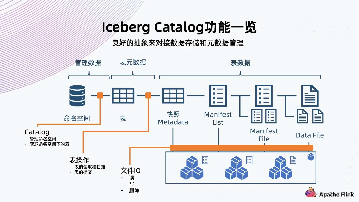 - 同时,Iceberg 提供命名空间以及表格的抽象,做完整的数据组织管理。