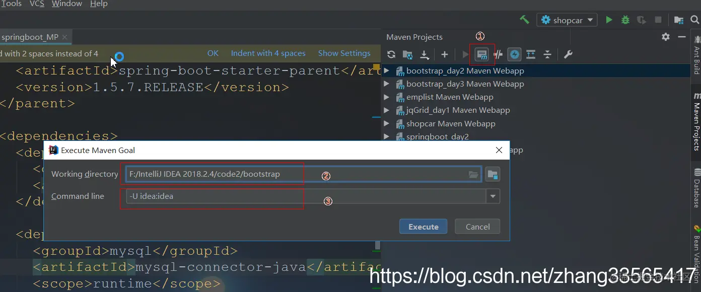 点击①处 ,然后在②出选择你的项目 ,在③处输入 -U idea:idea 命令 ,然后点击Execute就行了。