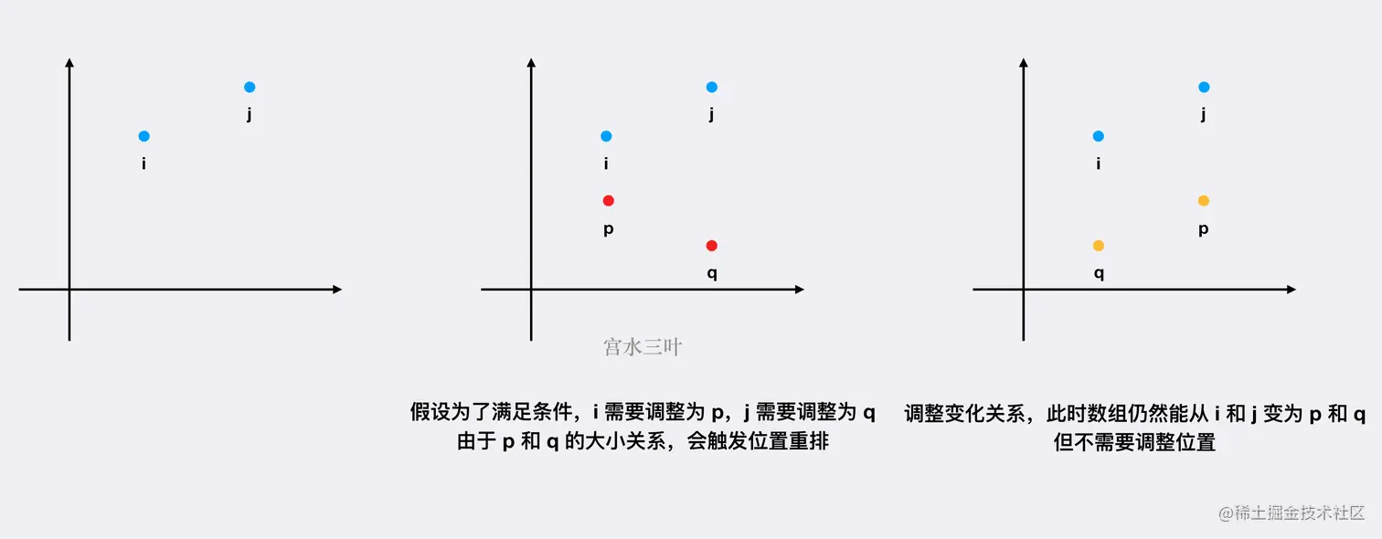 此时,我们能够通过调整它们的变化关系:点 变为点 、点 变成点 来确保同样满足条件,且不触发元素在有序数组中的位置重排。