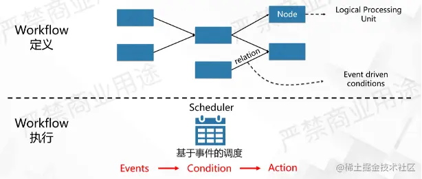 Workflow定义会定义Node和Relation,即定义节点和节点之间的关系。在Flink AI Flow里面,我们把一个节点定义成一个Logical Processing Unit,然后把这个节点之间的关系定义成Event driven conditions。在这样的抽象下面,在Workflow执行层面做了一个基于事件的调度。