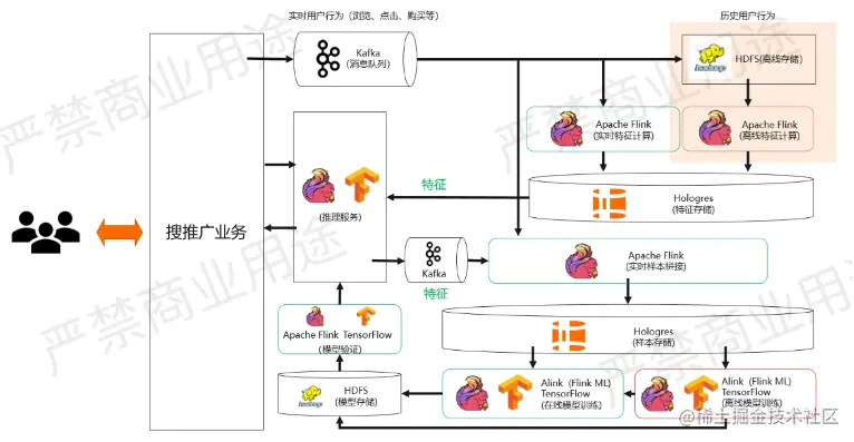 不管是在线还是离线的模型训练,都可以用Flink或者是FlinkML,也就是Alink来做。如果是传统机器学习的话,也可以用TensorFlow来做深度学习的模型训练,这样的模型还是可能会存到HDFS,然后通过Flink和TensorFlow做模型的验证,最后做线上的推理服务。
