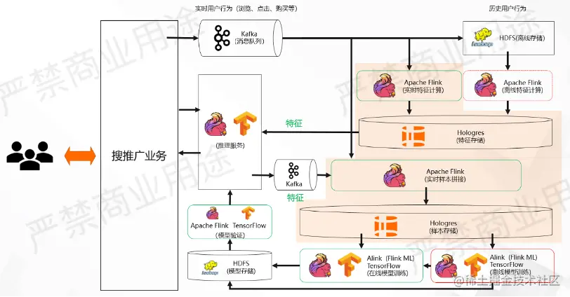 同样的道理,在推理服务这一侧,通过保留用来做推理的特征,放到后面的样本拼接里面,这里的消息队列也会使用Kafka。样本拼接这个事情会用Flink来做,Flink一个非常经典的应用场景做双流Join。把样本给拼接出来后,在把特征给加上,接着把算好的样本同样也放进Hologres里面做样本的存储。