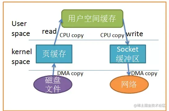 我们继续回到引文中的例子,我们如何减少数据拷贝的次数呢?一个很明显的着力点就是减少数据在内核空间和用户空间来回拷贝,让数据传输不需要经过user space,这也引入了零拷贝的一个类型:
