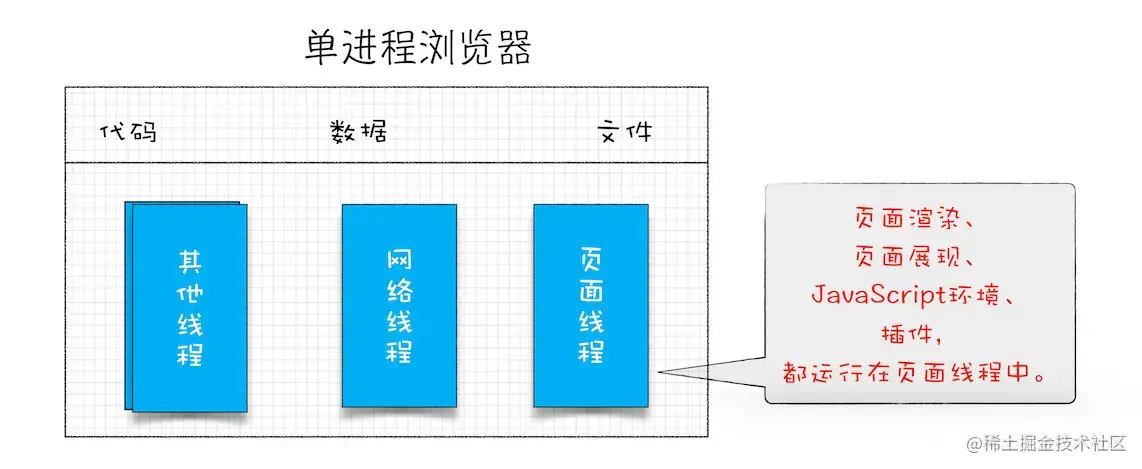 单进程浏览器顾名思义,就是浏览器的所有功能模块都是在一个进程中的,包括网络、渲染引擎、js运行环境、插件等。