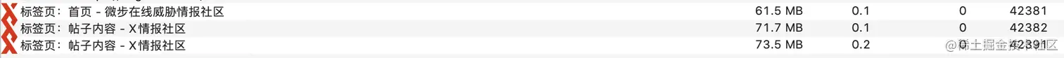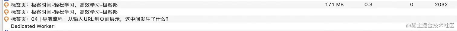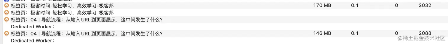 - 重新打开一个标签页时也会创建一个新的渲染进程,如上图,同为极客时间的标签,但是使用两个进程ID:2032,2088,因为2088进程所属页面是重新打开一个标签产生的。
