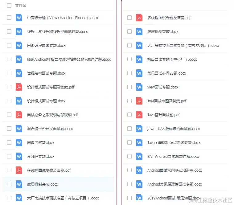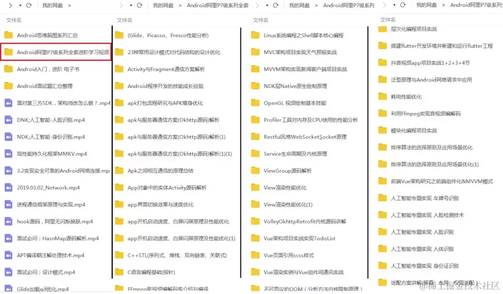 这里我为大家准备了一些我在面试后整理的面试专题资料,除了面试题,还总结出了互联网公司Android程序员面试涉及到的绝大部分面试题及答案,并整理做成了文档,以及系统的进阶学习视频资料,免费分享给大家,希望能帮助到你面试前的复习,且找到一个好的工作,也节省大家在网上搜索资料的时间来学习。