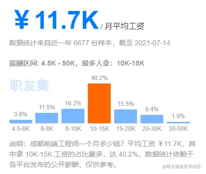 需求和供给决定了价格,所以当前前端工程师的薪资也反映了当前的求职市场。通过职友集的数据可以看出,成都前端工程师的薪资待遇远远超成都平均薪资。想来这也是前端工程师如此热门的原因之一。