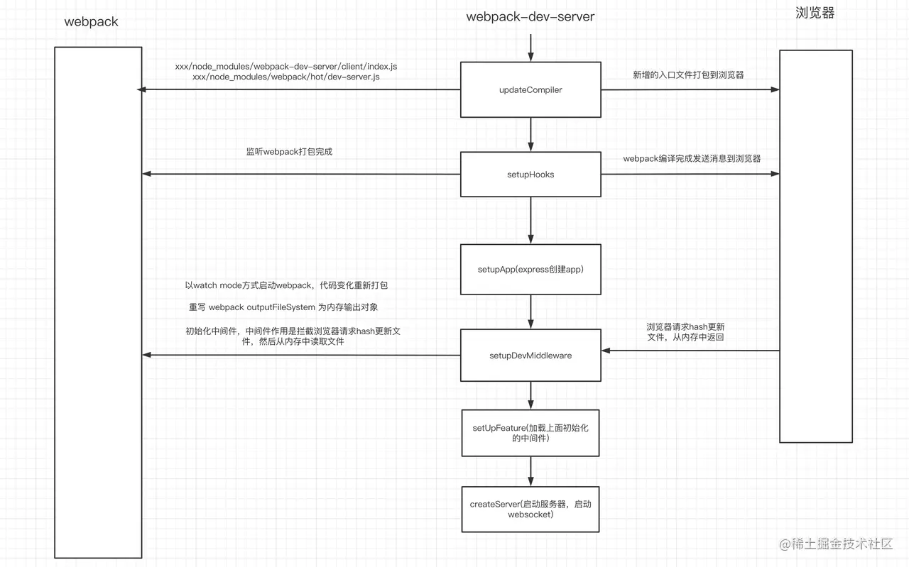 middleware 方法是一个中间件包装函数,然后返回这个中间件,中间件的作用是拦截浏览器请求的更新文件,从内存中读取内容返回,回到 setupDevMiddleware 方法