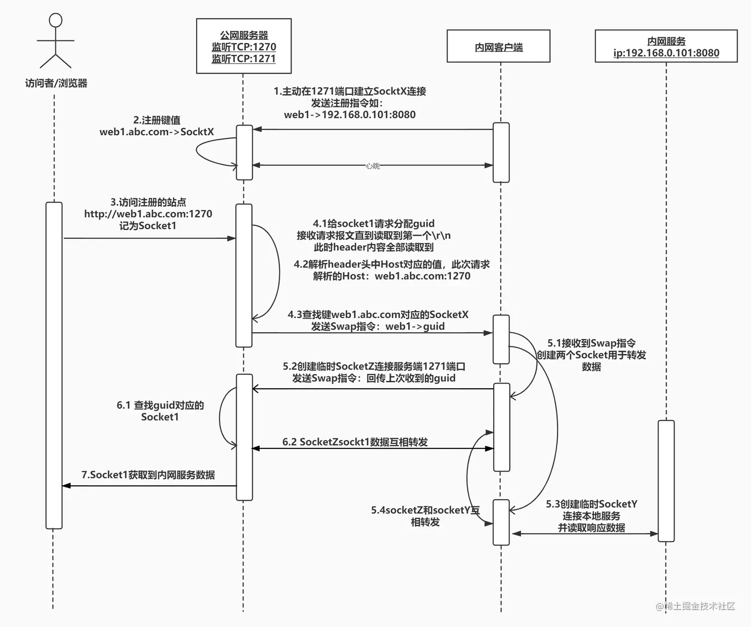 - 客户端收到Swap指令,创建2个临时socket分别连接本地服务SokcetY和服务端1271端口SocketZ,SocketZ连接后发送一条Swap应答指令携带guid,服务端收到此应答便知道该scoket是用于数据交换的