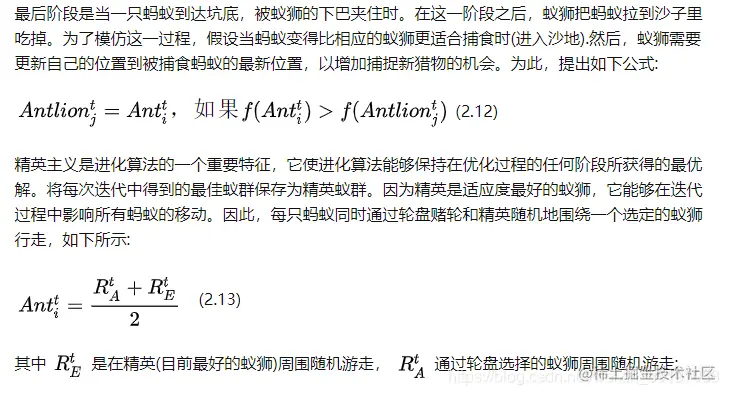 ALO算法模拟了蚁狮在自然界中的捕猎机制。它们的名字来源于它们独特的狩猎行为和它们最喜欢的猎物。蚁狮沿着圆形的路径移动,用它巨大的下颚在沙子中挖出一个锥形的坑。在挖好陷阱后,藏在圆锥形的底部(作为坐等捕食者),等待被困在坑中的昆虫(最好是蚂蚁),如图1所示。实施了蚂蚁随机行走、设置陷阱、用陷阱诱捕蚂蚁、捕捉猎物和重建陷阱等主要步骤。