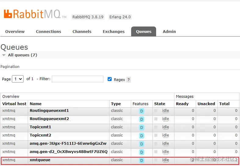 咱们先运行消费者,多运行几个,可以看到咱们的队列中已经有数据了,咱们运行的是2个消费者,因此此处是 2