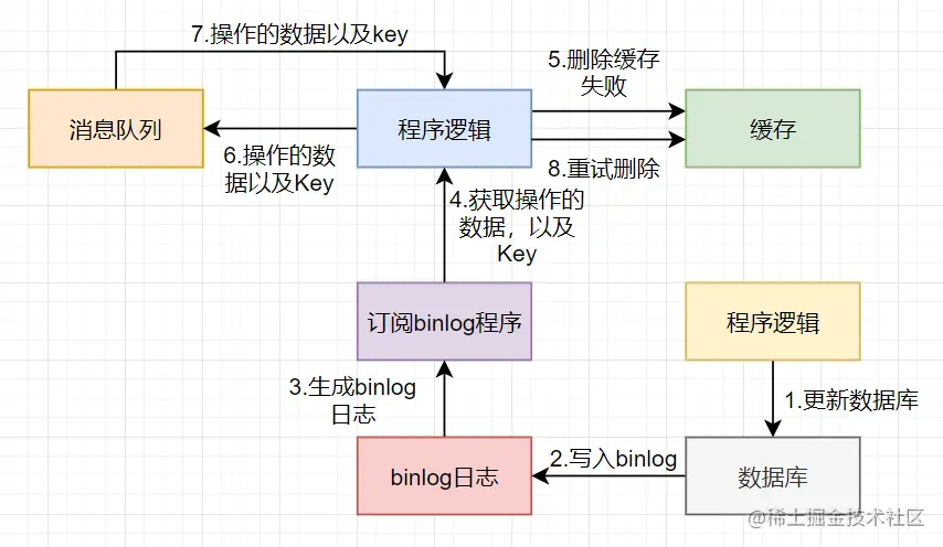 流程如下图所示: (1)更新数据库数据 (2)数据库将数据表数据的变更信息写入binlog日志当中 (3)订阅程序获取所需要的数据以及key (4)程序逻辑中处理具体的业务逻辑,接收订阅binlog、发起删除缓存的请求。 (5)尝试删除缓存操作,发现删除失败 (6)将这些信息发送至消息队列 (7)重新从消息队列中获得该数据,重试操作。