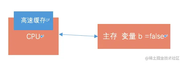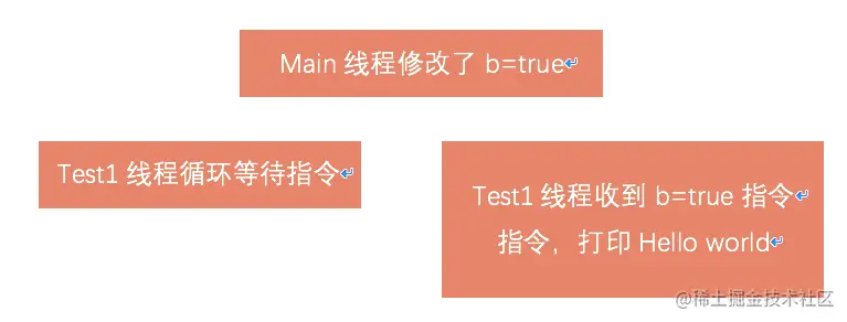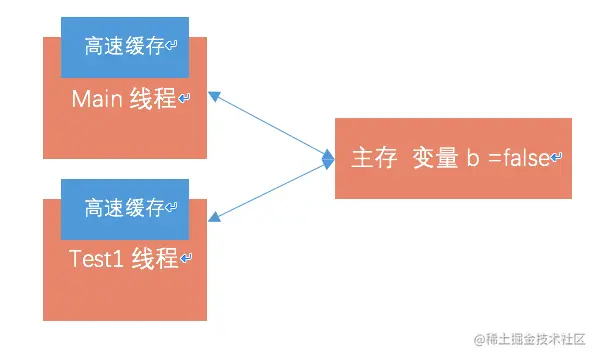 - 2.Test1线程启动,拷贝了变量b的副本到自己的高速缓存。